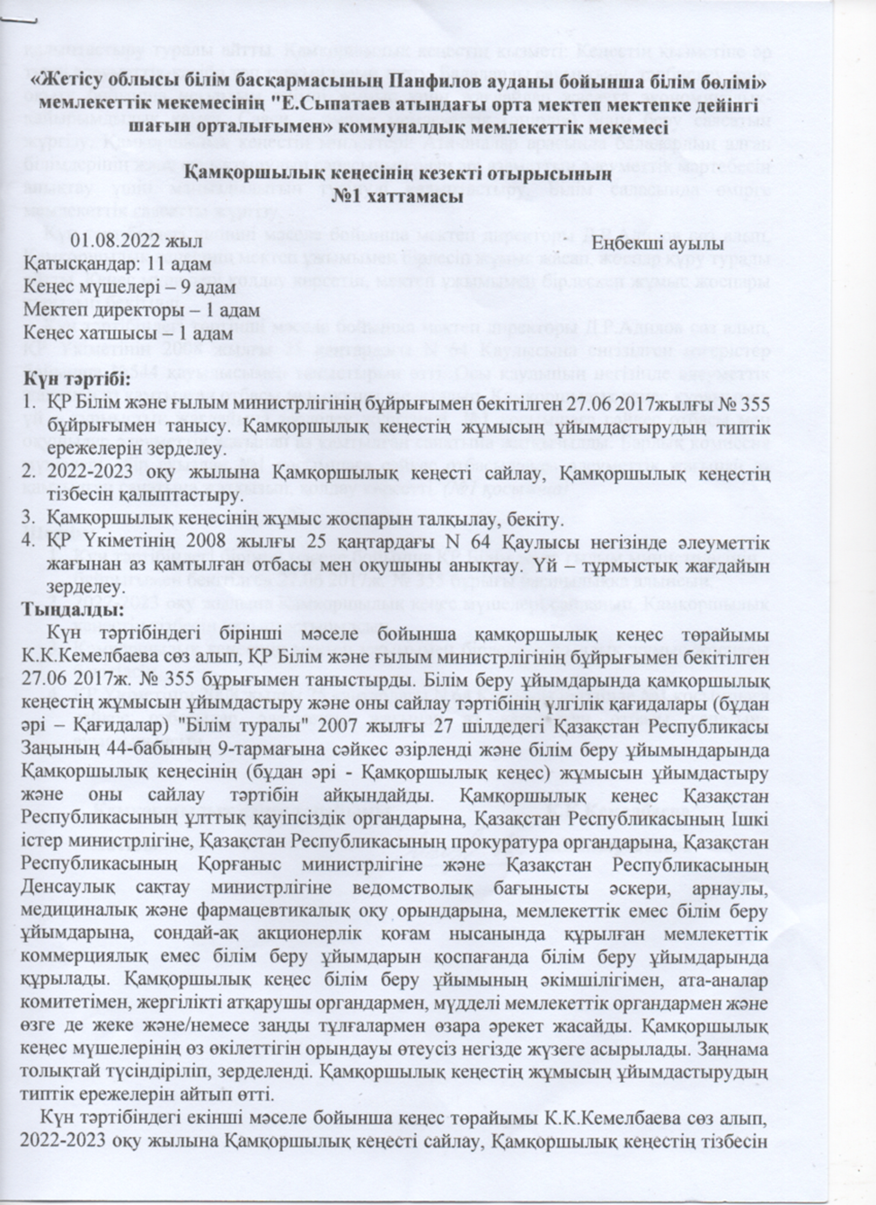 ҚАМҚОРШЫЛЫҚ КЕҢЕСІНІҢ ХАТТАМАЛАРЫ№1 2022-2023 ОҚУ ЖЫЛЫ » Е.Сыпатаев атындағы орта мектебі